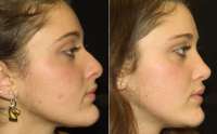 Le immagini dei profili mostrano la situazione prima e dopo l'intervento di mentoplastica associato ad un intervento di rinoplastica. Il profilo del volto mostra un mento pronunciato che ha richiesto un intervento di mentoplastica riduttiva per diminuire la sporgenza del mento ed armonizzarla così con i lineamenti del viso.