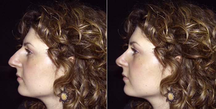 Le due fotografie affiancate, proposte qui in alto, mostrano dapprima un profilo curvo con naso in tensione a confronto con la simulazione del risultato in cui si propone un profilo lineare. In questo caso si è proceduto allo studio del profilo destro della paziente.