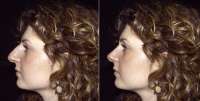 Le due immagini in basso mostrano due situazioni diverse: la prima fotografia mostra la sovrapposizione dell'immagine reale con quella della simulazione, che permette al paziente di valutare in modo tangibile l'entità del cambiamento. La fotografia successiva mostra la paziente dopo l'intervento di rinoplastica; il risultato post chirurgico dimostra quanto sia veritiero e attendibile lo studio dell'immagine eseguito e come la soluzione prospettata sia sostanzialmente coincidente con il risultato ottenuto.