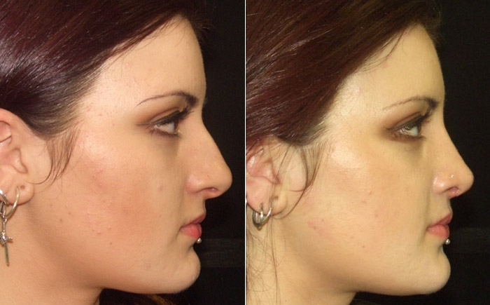 Nell'immagine a destra, scattata dopo l'intervento, si nota come la punta del naso sia in linea con la sporgenza del mento favorendo il ripristino delle corrette proporzioni tra naso e mento. In questo modo si ha l'impressione che il mento sia stato modellato, anche se in realtà l'unica parte del volto sottoposta ad intervento è stata il naso.